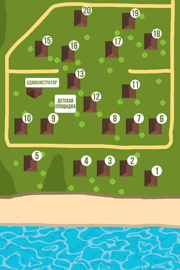 У домиков с номерами 1-10 окна с видом на берег, располагаются они в 2 береговые линии, как представлено на схеме ниже.
